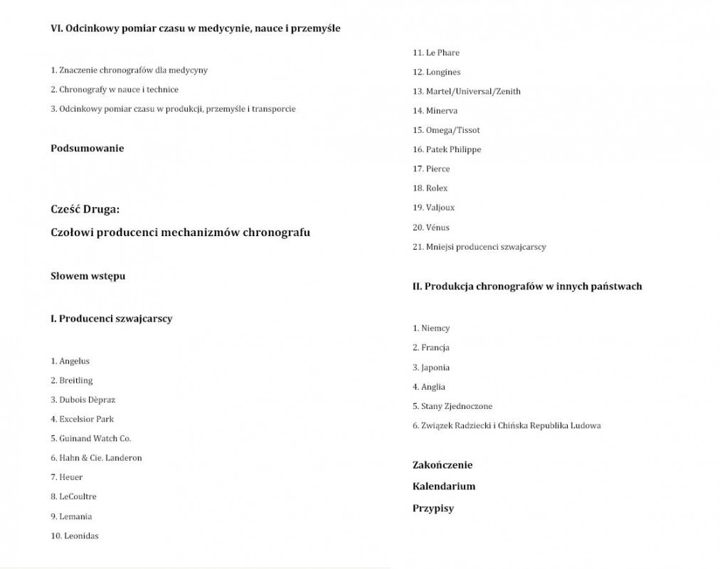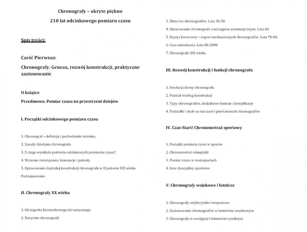 Niniejsza publikacja została podzielona na dwa uzupełniające się tomy. Pierwszy nosi tytuł Chronografy – ukryte piękno. 210 lat odcinkowego pomiaru czasu. W jego pierwszej części omawiam historię i ewolucję tego typu zegarków (rozdz. I i II), zagadnienia techniczne, dotyczące mechanizmów chronografów (rozdz. III) i ich zastosowanie w poszczególnych dziedzinach ludzkiego życia ( rozdz. IV, V i VI). Druga część tomu przybliża Czytelnikowi historię producentów chronografów w poszczególnych państwach.